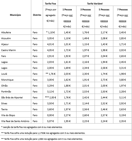 De destacar que durante o último ano, no município de Vila do Bispo, a tarifa fixa foi gratuita em todas as dimensões familiares, enquanto que em Albufeira a tarifa fixa é também gratuita para agregados familiares com mais de 5 elementos.