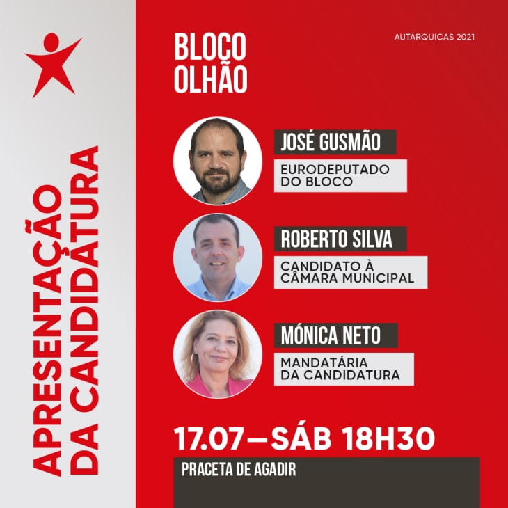 É já hoje, pelas 18h30, na Praceta de Agadir, que o BE/Olhão irá fazer a apresentação pública da sua candidatura às eleições autárquicas de setembro, tendo como oradores: José Gusmão, economista e eurodeputado do Bloco de Esquerda, Mónica Neto, mandatária da candidatura autárquica e Roberto Silva, candidato independente à Câmara Municipal de Olhão.