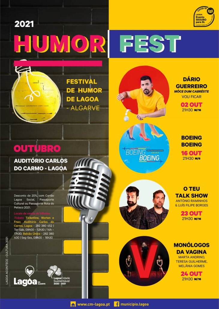https://ticketline.sapo.pt/evento/humor-fest-2021-58011 e ainda na Worten, Fnac ou bilheteiras físicas do Auditório Carlos do Carmo e Balcão Único da Câmara Municipal de Lagoa.