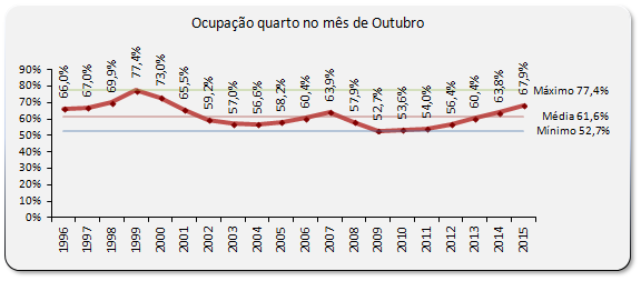 Relativamente a 2014, o mês de Outubro de 2015 apresentou nas unidades de alojamento do Algarve, uma taxa de ocupação global média/quarto de 67,9%, mais 6,4% que em 2014.