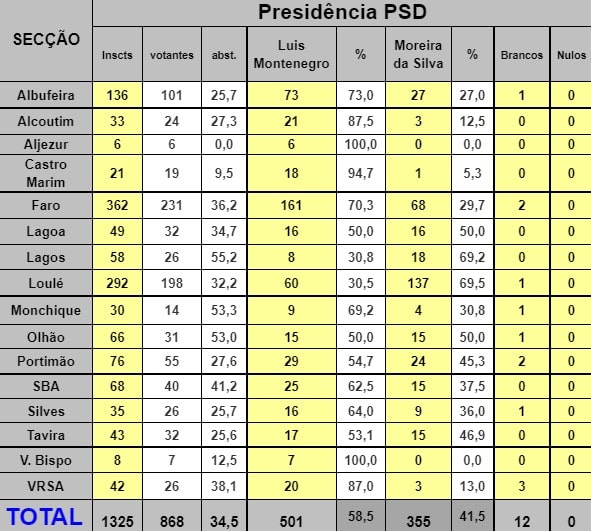 Dados do gabinete de comunicação do PSD Algarve, confirmam que na região, Luís Montenegro venceu com 58,5% contra 41,5% de Jorge Moreira da Silva.