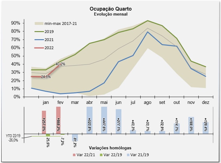 De acordo com os resultados divulgados, a taxa de ocupação global média/quarto em fevereiro, foi de 40,2%, 3,1 pontos percentuais abaixo do verificado em fevereiro de 2019 (-7,2%). Em termos acumulados, desde o início do ano, este indicador encontra-se 26,0% abaixo (-11,3pp) do verificado no período homólogo de 2019.