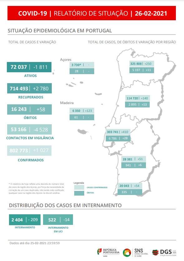 Relativamente aos Açores, o relatório de hoje reflete uma descida do número total de casos da região, por força da necessidade de correção de um caso duplicado, não tendo sido notificado qualquer caso na região dos Açores no dia em análise.