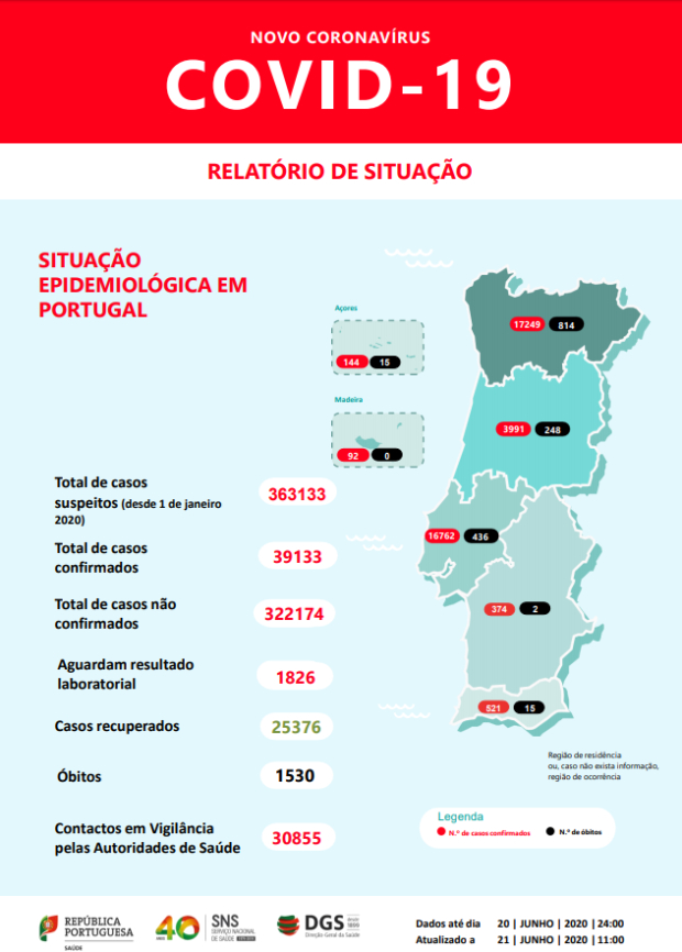 O relatório indica que a região Norte é a que regista o maior número de mortos 814 e 17.249 casos, seguida da região de Lisboa e Vale do Tejo com 436 óbitos e 16 762 casos, da região Centro com 248 óbitos e 3991 casos, do Alentejo 374 casos e 2 óbitos, Açores 144 e 15 óbitos e Madeira com 92 casos positivos.