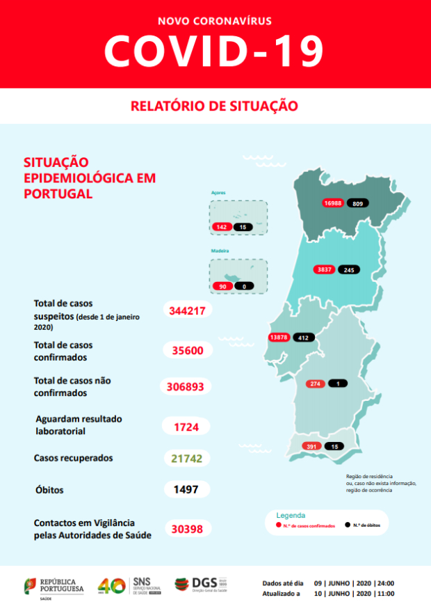 O relatório indica que a região Norte é a que regista o maior número de mortos 809 e 16.988 casos, seguida da região de Lisboa e Vale do Tejo com 412 óbitos e 13878 casos, da região Centro com 245 óbitos e 3837 casos, do Alentejo 274 casos e 1 óbito, Açores 142 e 15 óbitos e Madeira com 90 casos positivos.